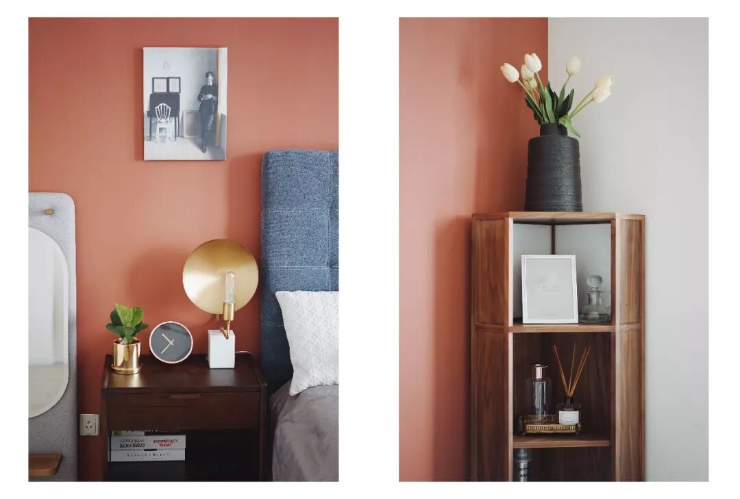 次卧则选用了今年很洋气的砖红橘作为主色调