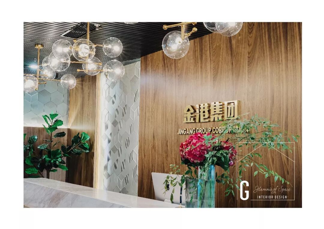 办公室前台左侧设计为墙体做了封闭